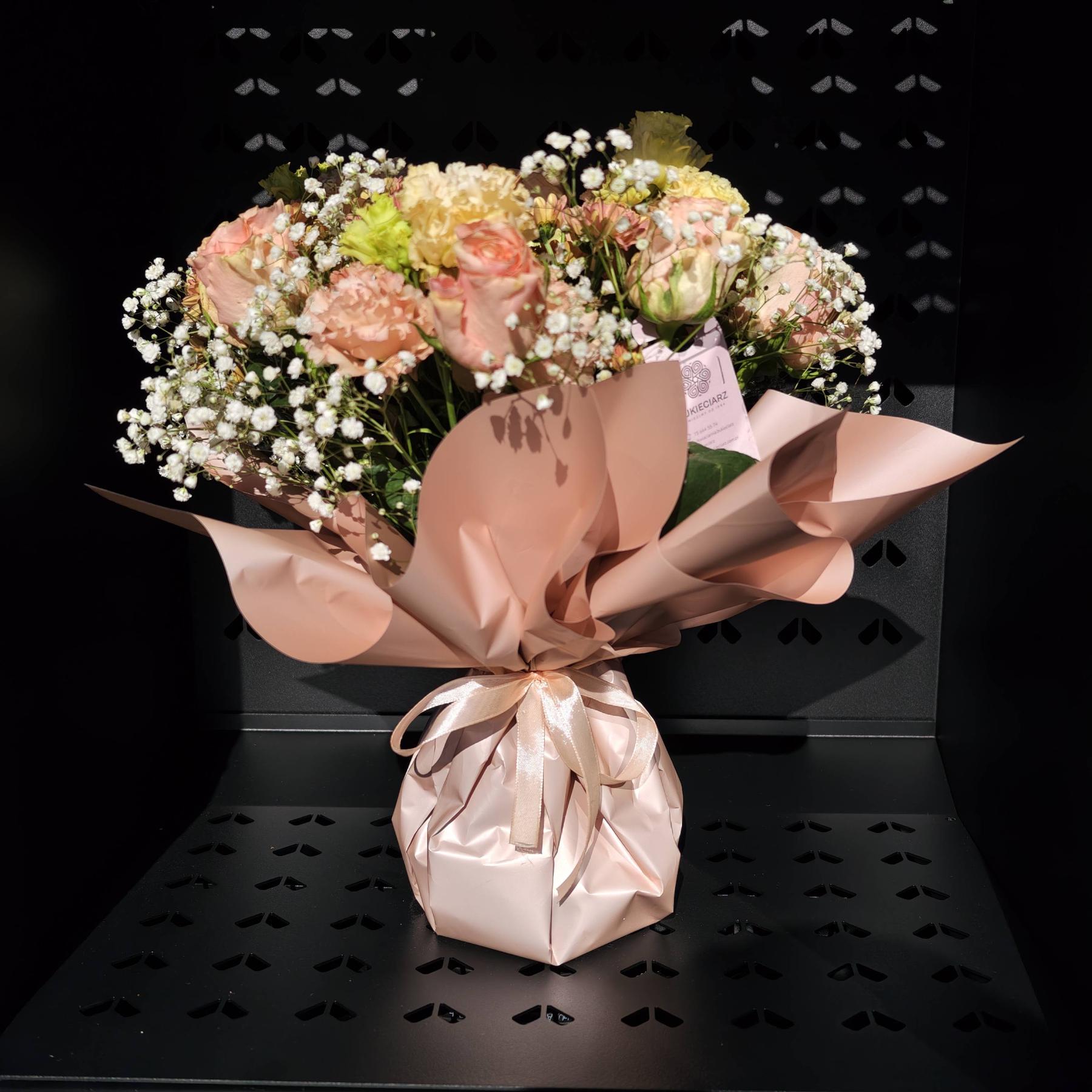 Uroczy bukiet z róż w pudrowych odcieniach, goździków i delikatnej gipsówki. Eleganckie opakowanie podkreśla romantyczny charakter kompozycji, która idealnie nadaje się jako prezent dla kobiety na miły gest lub wyjątkową okazję.
