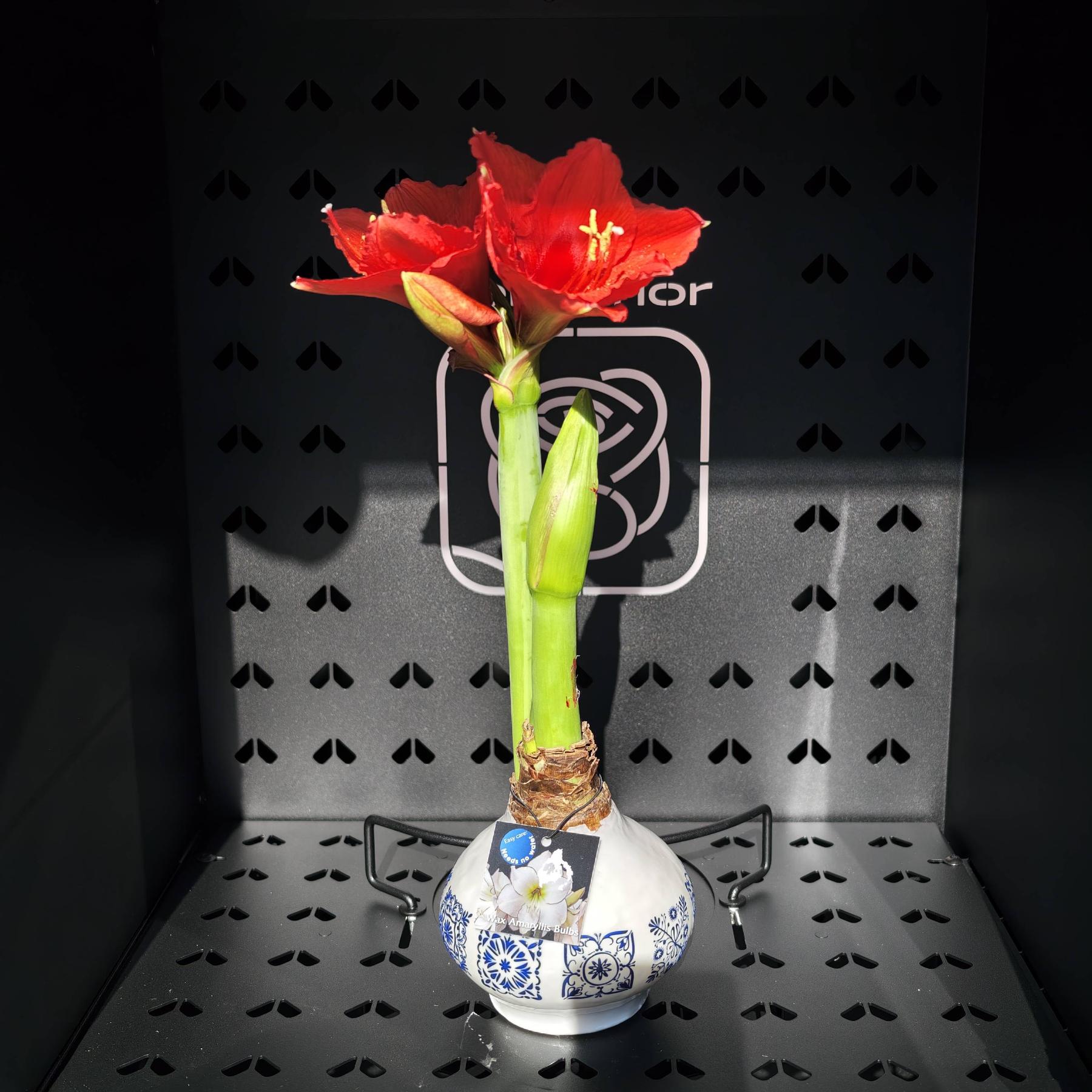 Wyjątkowa kompozycja z czerwonego amarylisa w osłonie w wosku inspirowanym ceramiką bolesławiecką. Okazałe kwiaty o intensywnej barwie tworzą efektowny i bardzo elegancki prezent.