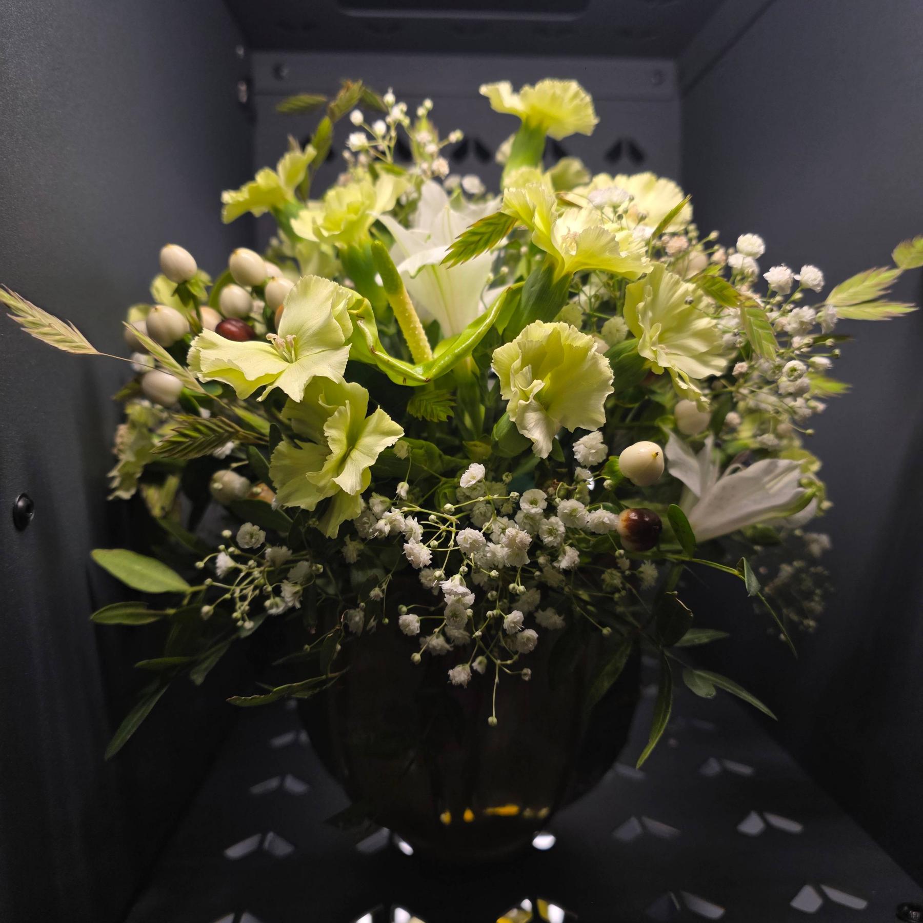 Delikatna, świeża kompozycja w ceramicznym naczyniu. Jasne odcienie zieleni i bieli wprowadzają spokój i naturalną elegancję. Idealny wybór na subtelny gest dla kobiety – lekki, a jednocześnie wyjątkowy.