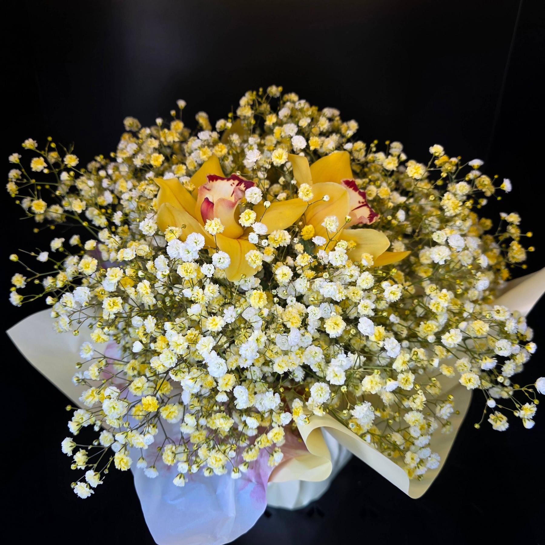 Lekki i subtelny bukiet, w którym drobna gipsówka tworzy miękką, chmurkową formę, a żółte akcenty nadają mu ciepła i elegancji. Całość wygląda bardzo delikatnie, ale jednocześnie przyciąga uwagę swoją jasnością i lekkością.