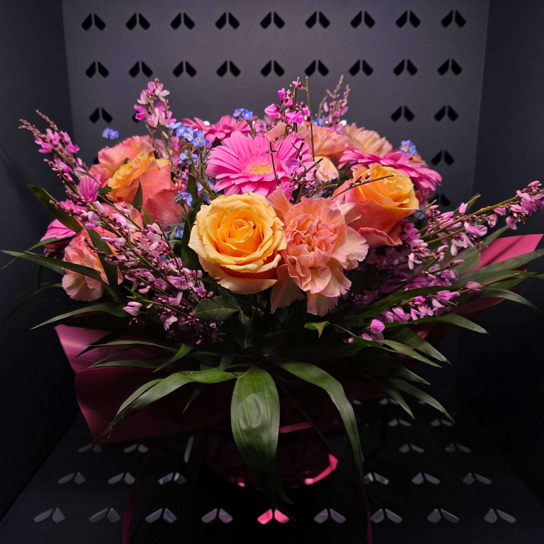 Bogaty bukiet w pastelowych i ciepłych odcieniach – róże, gerbery i delikatne dodatki tworzą pełną, dekoracyjną formę.