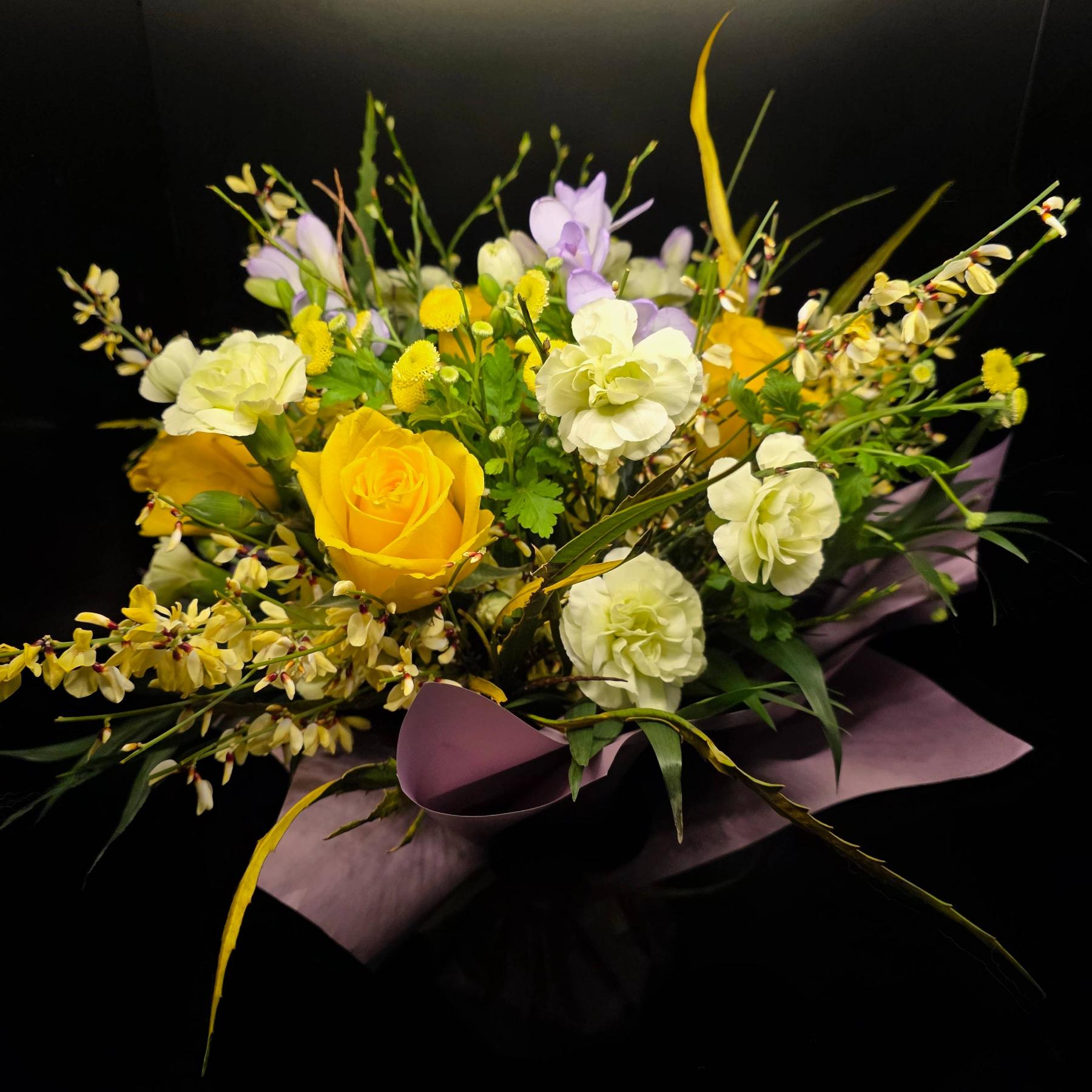 Radosny bukiet w odcieniach żółci i kremu, w którym klasyczna róża łączy się z drobnymi kwiatami i naturalnymi dodatkami. Kompozycja jest lekka, ale dynamiczna – pełna życia i pozytywnej energii.