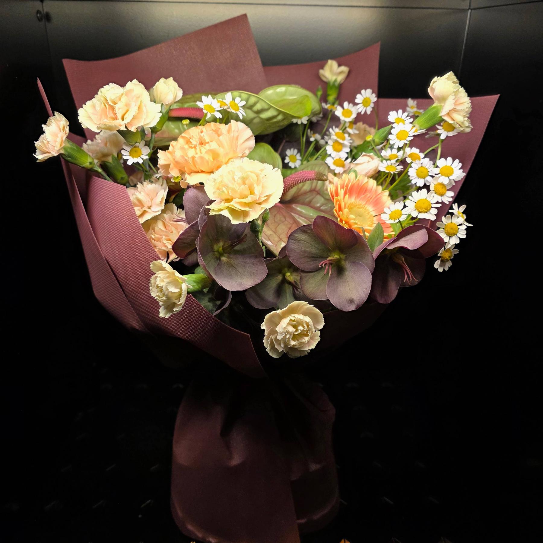 Ciepły bukiet w odcieniach moreli, kremu i delikatnej zieleni, przełamany subtelnymi, naturalnymi dodatkami. Różnorodność kwiatów i struktur tworzy kompozycję pełną miękkiej energii i spokojnej elegancji.