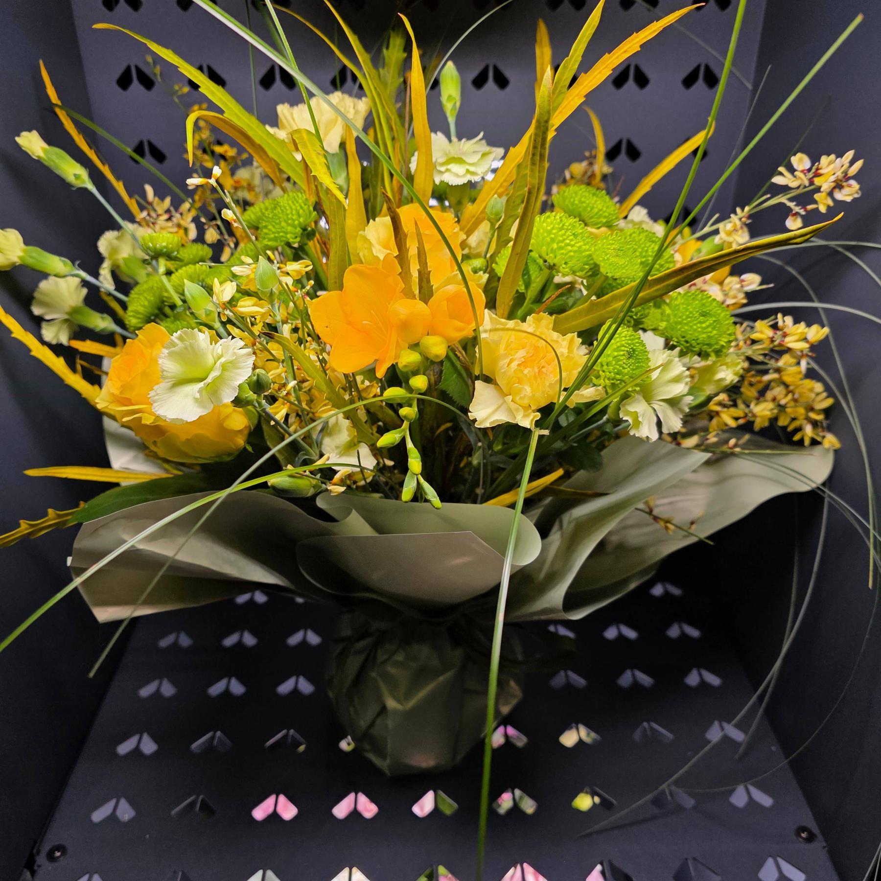 Nowoczesny bukiet o wyraźnej formie, w której dominują odcienie zieleni i żółci. Dynamiczne linie i różnorodność struktur nadają jej charakteru.