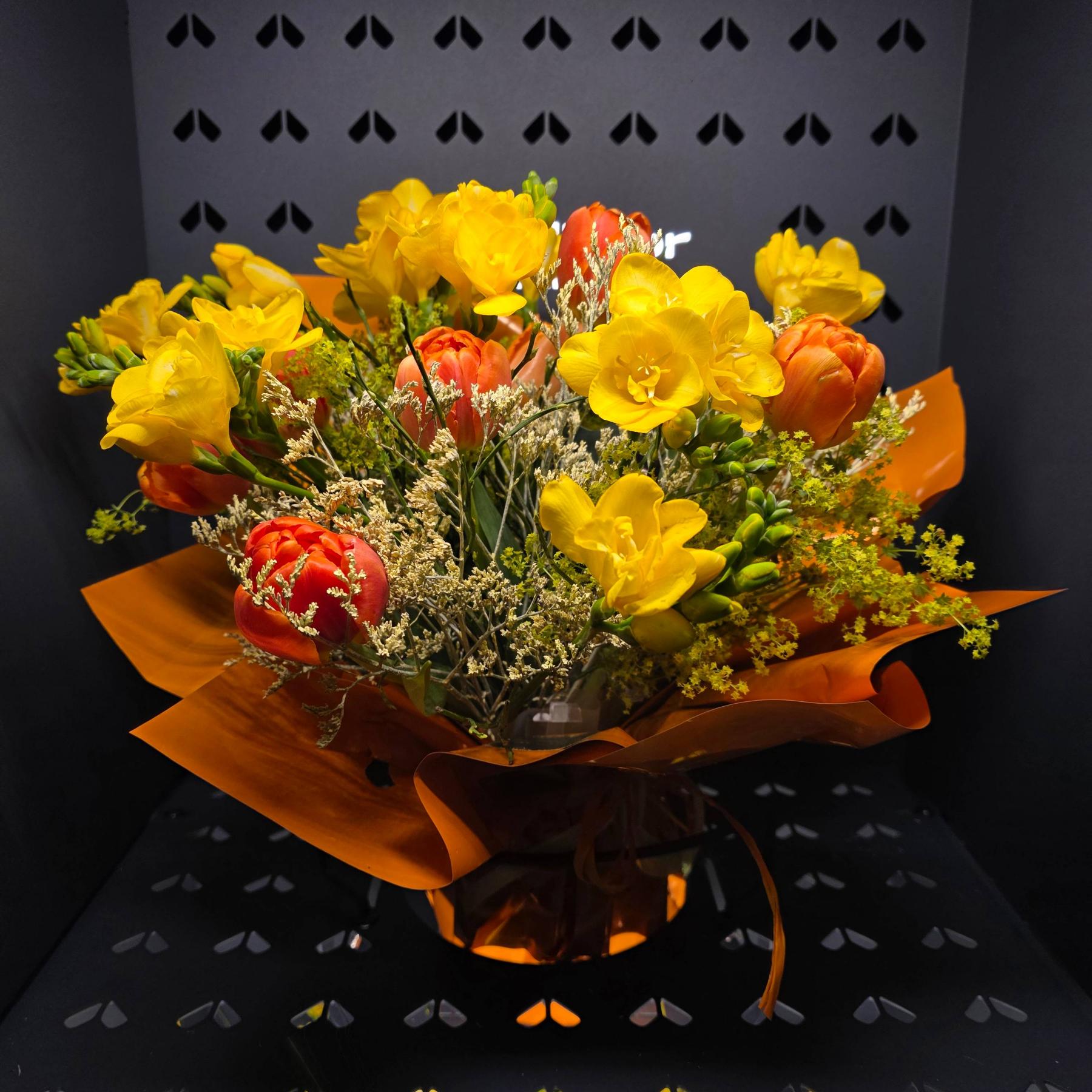 Energetyczny bukiet w odcieniach pomarańczu i żółci, który wnosi ciepło i optymizm. Intensywne kolory tworzą radosną i wyrazistą kompozycję.
