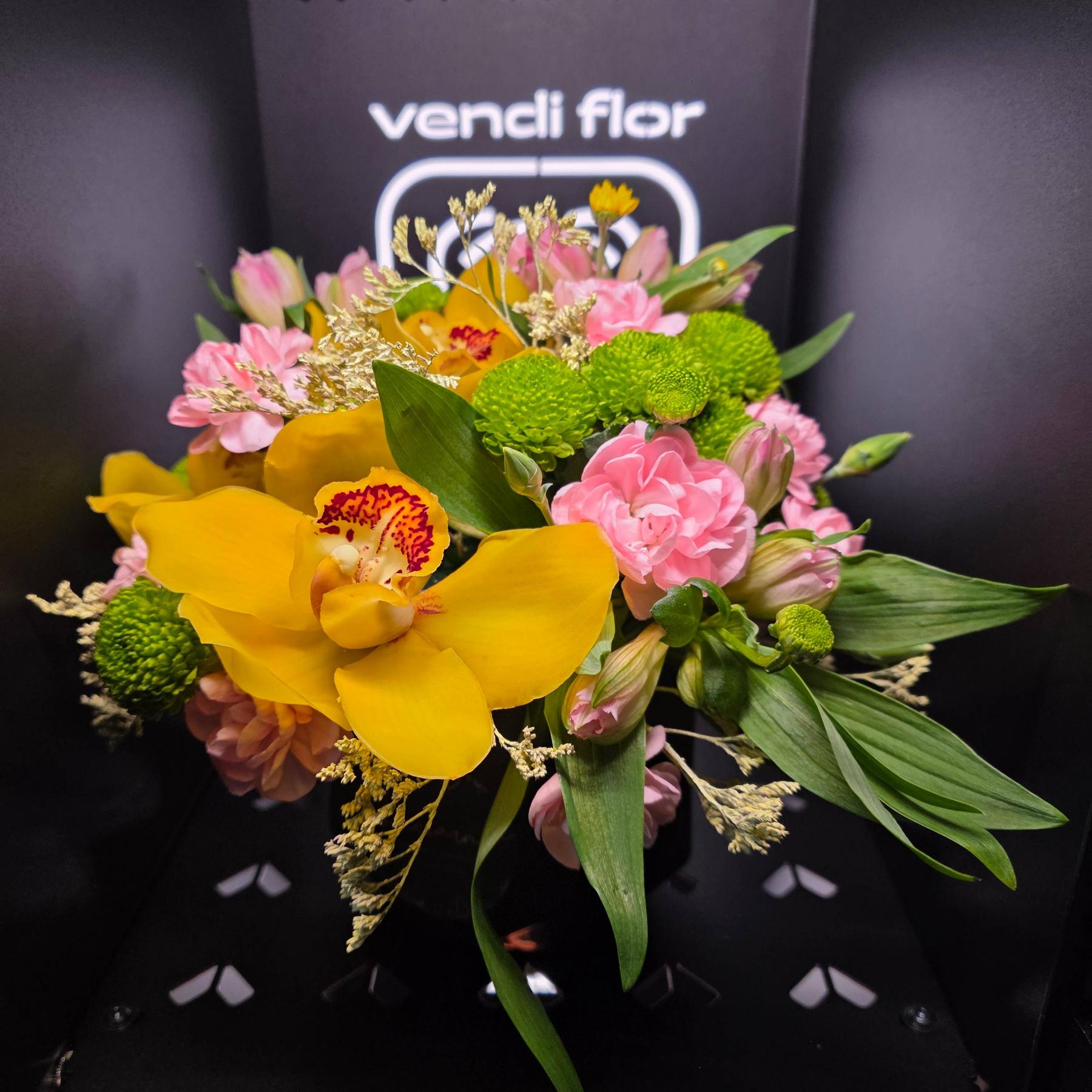 Lekka i świeża kompozycja w ceramicznym naczyniu łącząca intensywną żółć orchidei z pastelowym różem i zielenią dodatków. Całość wygląda naturalnie, jakby była zebrana z letniego ogrodu, ale z wyraźnym, nowoczesnym akcentem.