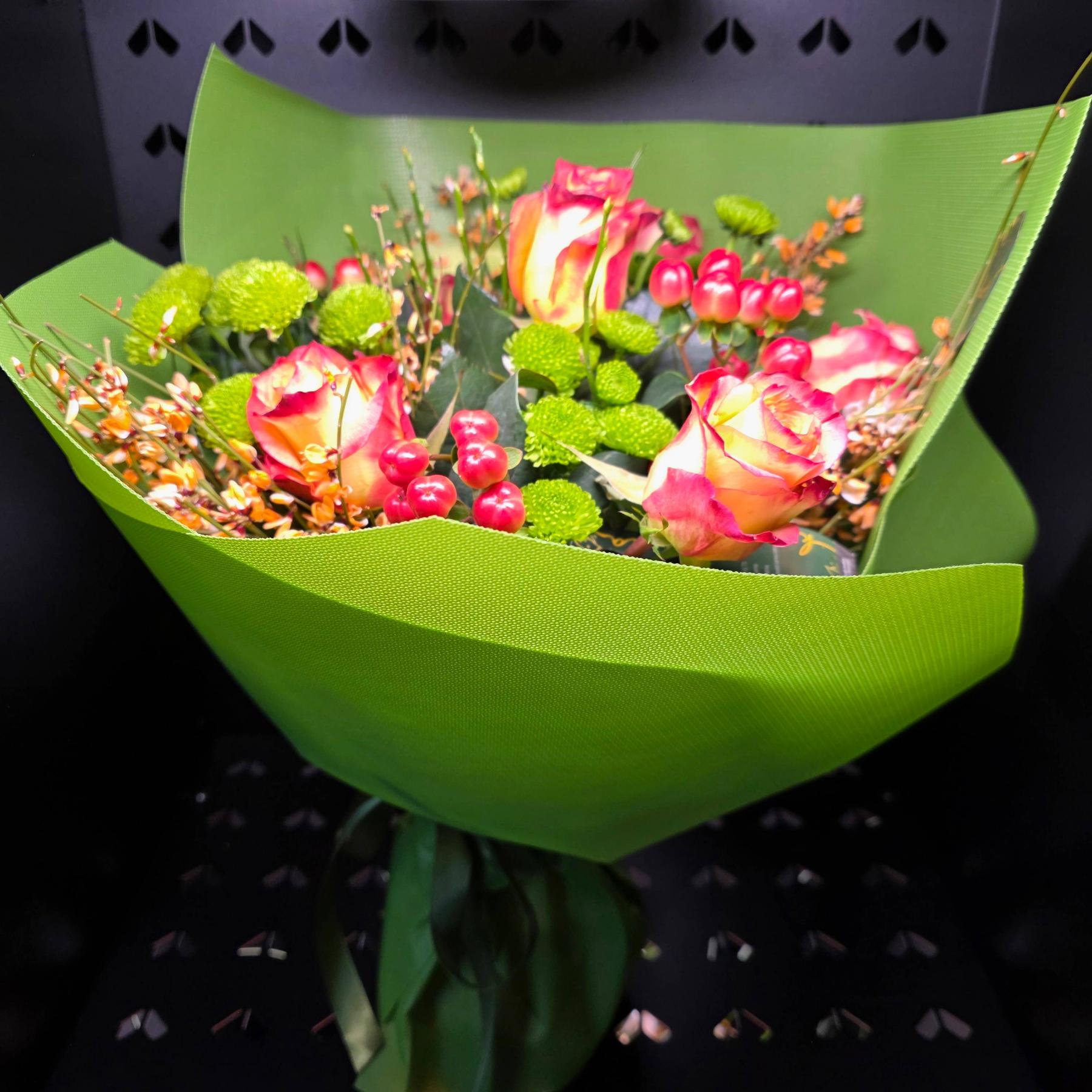 Wyrazisty bukiet w zielonej oprawie, z intensywnymi akcentami czerwieni i świeżej zieleni. Róże i dekoracyjne dodatki tworzą dynamiczną, nowoczesną kompozycję o mocnym charakterze.