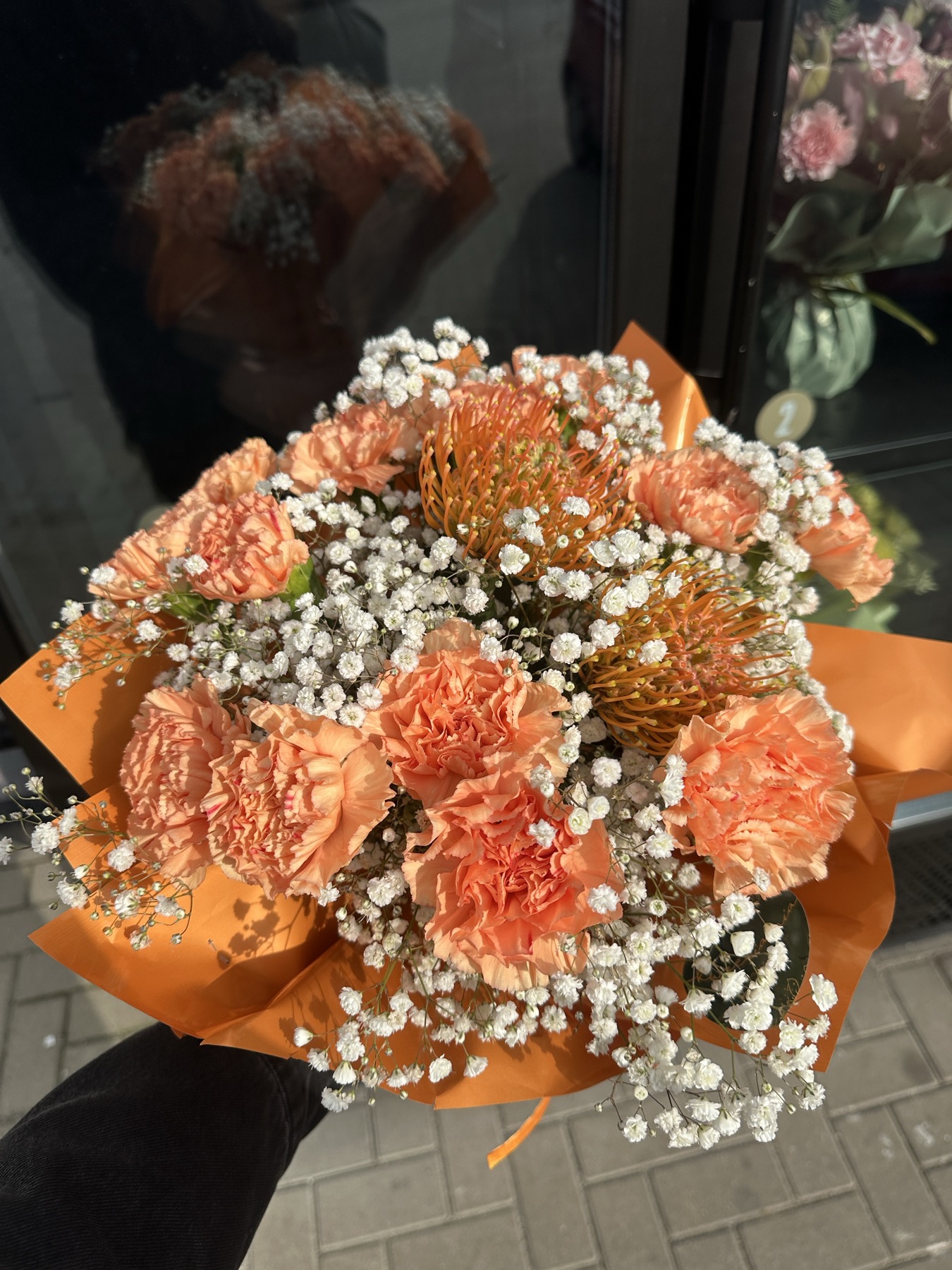 Wyrazisty bukiet w ciepłych, morelowo-pomarańczowych tonacjach, który przyciąga spojrzenia i dodaje pozytywnej energii. W kompozycji dominują pełne goździki w soczystym odcieniu, efektowne kwiaty protei o egzotycznym charakterze oraz delikatna gipsówka, nadająca całości lekkości i romantycznego wykończenia.