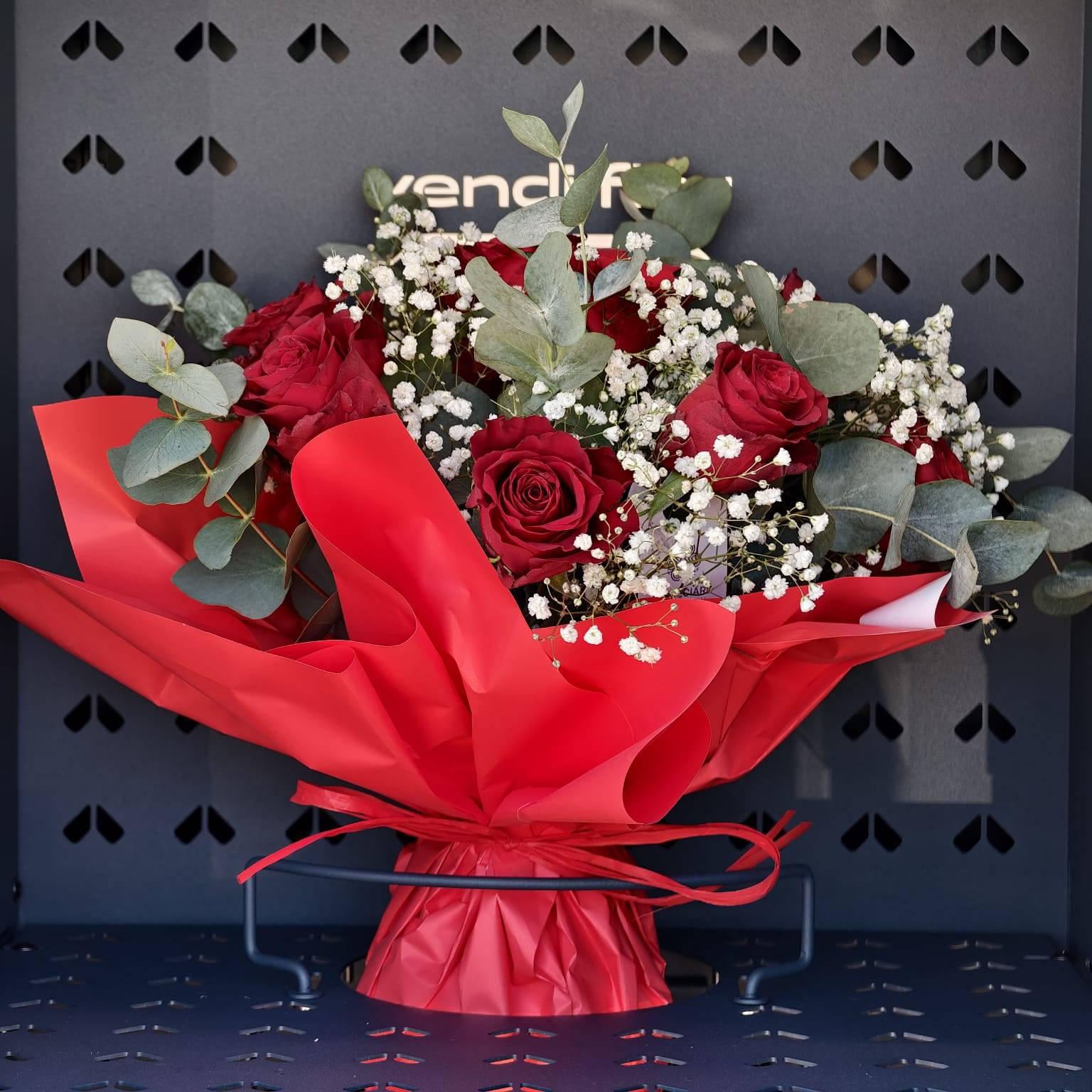Klasyczny bukiet z czerwonych róż w otoczeniu delikatnej gipsówki i świeżego eukaliptusa. Kompozycja pełna elegancji i emocji, idealna aby wyrazić podziw, wdzięczność i uczucia. Pięknie zapakowany w czerwony papier, gotowy aby sprawić radość wyjątkowej kobiecie.